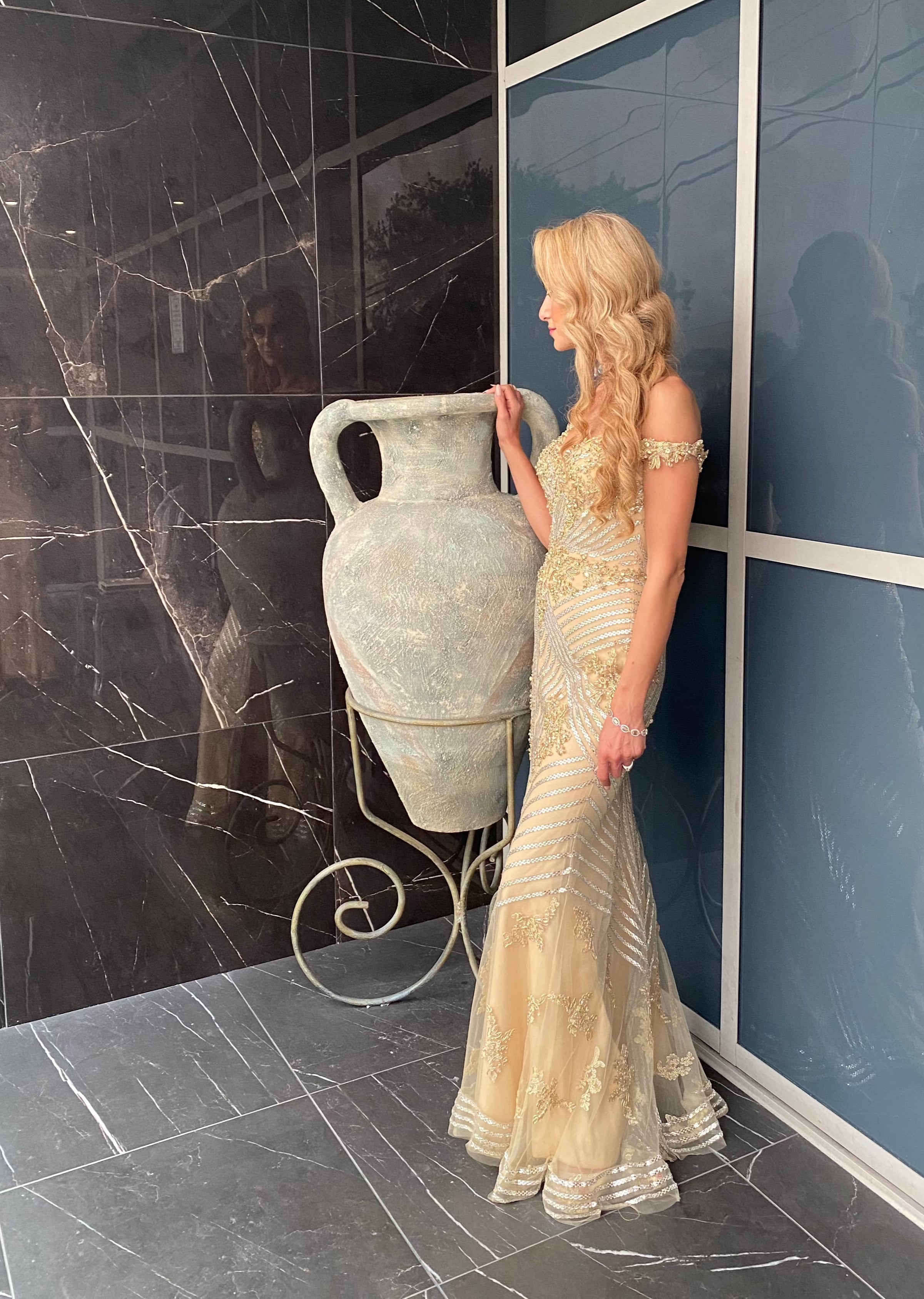 Gold beaded couture gown